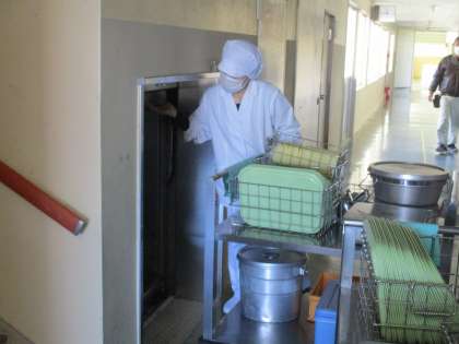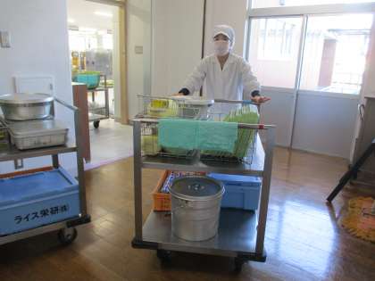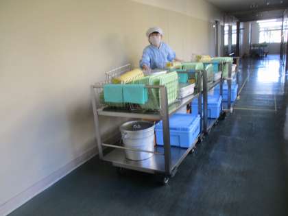 給食搬入員さんが、ワゴン車ですべての教室前まで運びます。