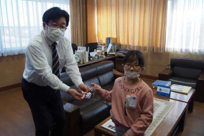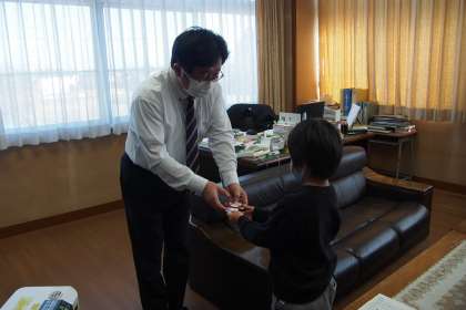 校長先生には、「いつも横断歩道で見守ってくださってありがとうございます」と感謝の気持ちを伝え、プレゼントを渡していました。