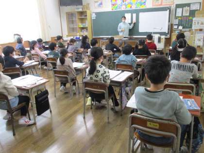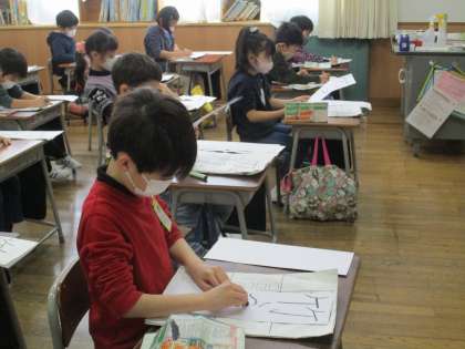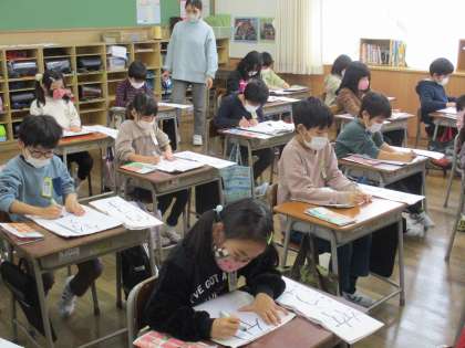 2年生は、硬筆墨で「竹うま」と書きます。 静かな雰囲気です。