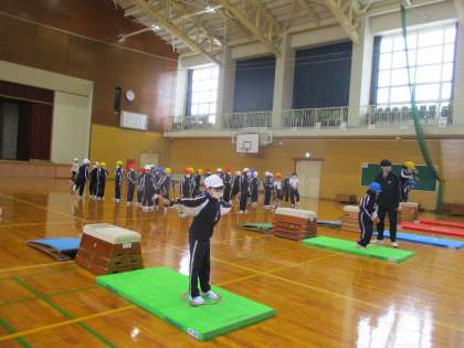 とび箱では、両足で上に乗ってポーズを決めて降りたり、拍手をして降りたりしました。