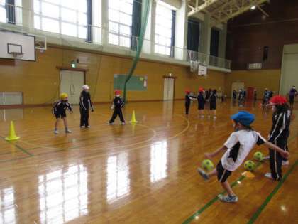 ボールを蹴って、円の中心線を超えると1点です。みんな上手にボールを蹴っていました。