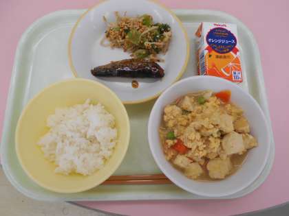 1月20日(木)今日の献立は、ごはん・いわしの梅煮・いり大豆和え・厚揚げの錦とじ・オレンジジュースでした。今日は、卵のお話をしました。卵には、血や筋肉など、体をつくるたんぱく質が多く含まれていて、「たんぱく質の王様」とも呼ばれています。大久保小学校に届いた卵は、約430個でした。それを、調理員さんが1つ1つ割ってくださいました。とても大変な作業です。おかげさまで、おいしい錦とじができました。ありがとうございます。