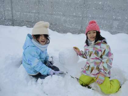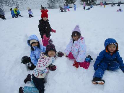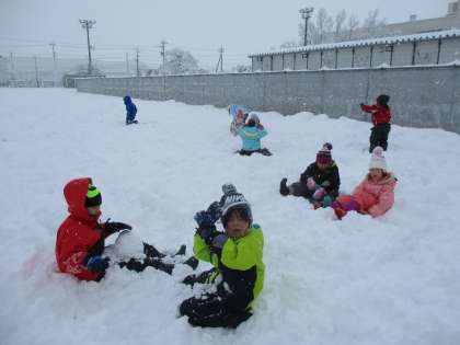 グラウンドに出て、雪遊びをしました。みんな、楽しそうに遊んでいました。