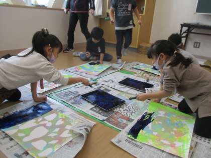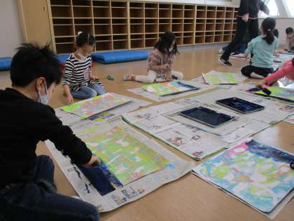 カラーで塗った画用紙に、好きな形に切ったシールを貼りました。そして、上から紺色のローラーで塗りました。