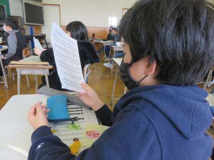 今日は楽譜を見ながら、二部合唱の音程の違いを聴き分けていました。最後に主旋律を口ずさみました。