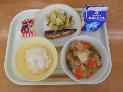 2月3日(木)の献立は、ごはん・牛乳・いわしの土佐煮・野菜ソテー・豚肉とじゃがいものうま煮・節分豆・牛乳でした。