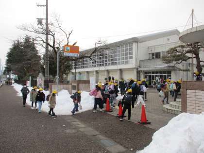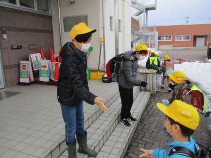 「あいさつジャンケン」で下級生を出迎えています。