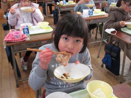 給食の時間です。「おなか、すいたあ」と言っていた子供たちにとって、待ちに待った給食です。