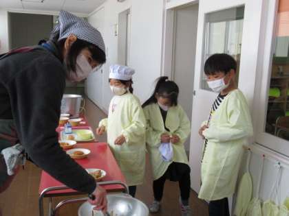 配膳後、給食当番の子供たちは、給食着の着脱がとても上手です。