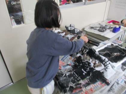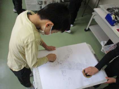 紙版画にインクを付け、紙に写し取っています。