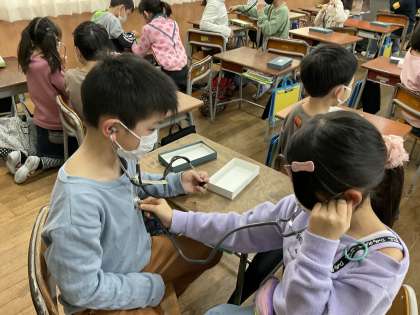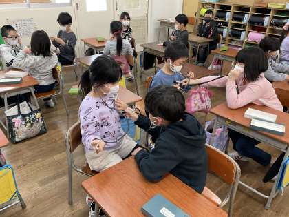 1組では、わたしたんけんの学習の一環として、心臓の音を聞いてみました。
