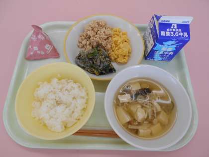 2月21日(月) 今日の給食 公開日 2022/02/21 更新日 2022/02/21 給食室から 2月21日(月)今日の献立は、そぼろ丼(鶏そぼろ・炒り卵)・よごし・すまし汁・ひなあられでした。 今日は、一足早いですが、ひなまつり献立でした。鶏そぼろと白いごはんが相性ばっちりでした。