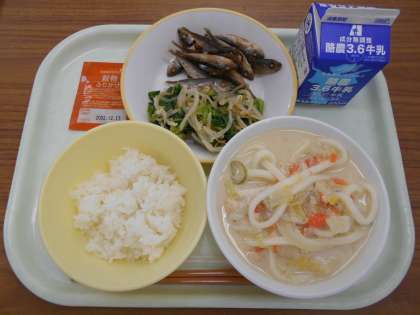 2月22日(火)今日の献立は、ごはん・小あじの唐揚げ・菜花ひたし・白ごま豆乳うどん・穀物ふりかけでした。