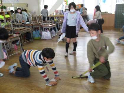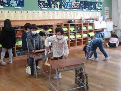 1年生は、自分の教室や廊下、生活科室などを掃除しています。拭いたり、掃いたり、磨いたりとがんばっています。