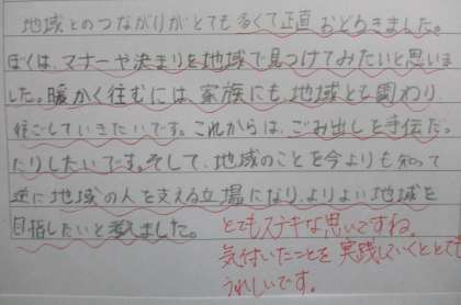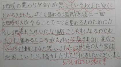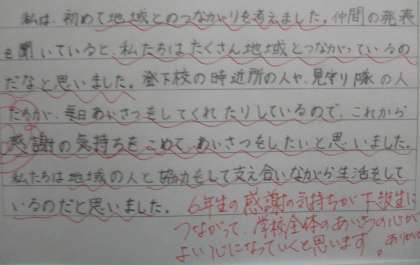 家庭科の学習「あなたは地域や家庭の宝物」で、地域や家庭と自分とのつながりについて学習しました。学習のまとめで書いた6年生の感想を紹介します。