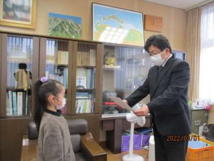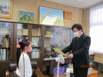 富山県小中高校生書初大会の受賞者と「わたしのママ・パパを書 きましょう」の作品の入賞者です。礼儀正しくきびきびと行動することができる二人でした。