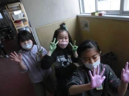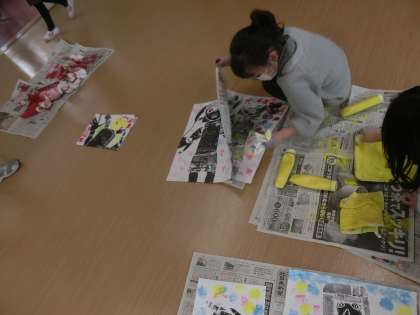 自分の版画に色鮮やかな模様をつけて楽しむ様子も見られました。手についた色を落とす時は、とても楽しそうでした。
