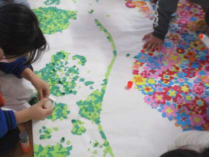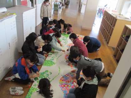 朝の会の前の様子です。廊下で細かくちぎった紙を貼り合わせ、卒業祝いの掲示物を作っています。