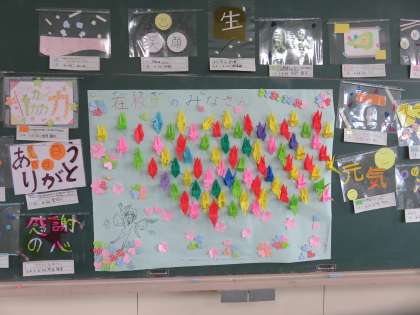 6年生からのお返しはお世話になった先生方のクイズと、在校生のみんなへ感謝の思いをこめたプレゼントを紹介しました。卒業プロジェクト担当者を中心に準備を進めてきました。在校生、先生方への感謝の思いを、言葉や態度に変えて表現することができました。