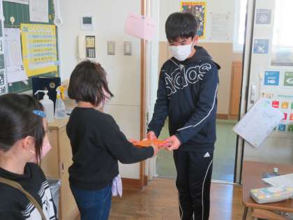 1・2年生の代表者が、教室までプレゼントを届けに来てくれました。1年生からは一人ひとりの似顔絵付きのメダル、2年生からは全校のみんから集めたメッセージカードをもらいました。