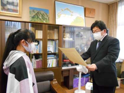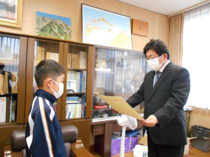 清流環境作文コンクールで優秀な成績を収めた4人の子供たちを表彰しました。