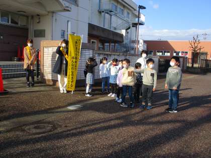 1年生の子供たちが、あいさつをしたいと言って正門に出てきました。