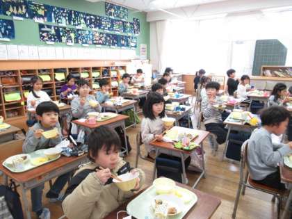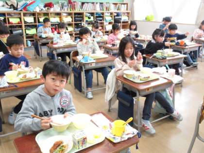給食の時間は、感染症防止のため静かに食べています。嫌いな物でも食べることができるようになってきました。