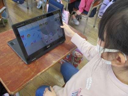 自分が描いた絵が動くと「すごい!」「おもしろい!」と子供たちは楽しんでいました。