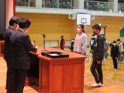 3月17日(木) 6年生 修了式 その1 公開日 2022/03/17 更新日 2022/03/17 2023年度 6年生 今日は学校生活最後の修了式がありました。各学級の代表者に、校長先生より修了証が手渡されました。