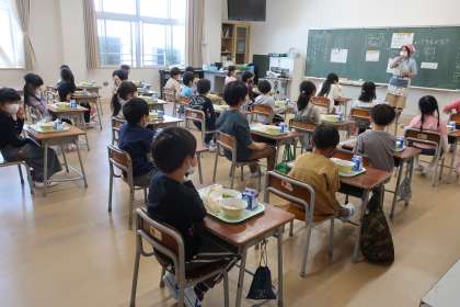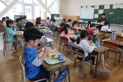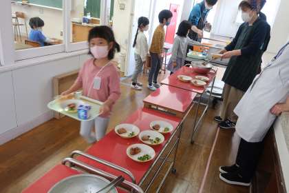 今日から、給食が始まりました。小学校での初めての給食です。どのクラスの子供たちも、先生から聞いた手順に沿って、手際よく準備ができました。