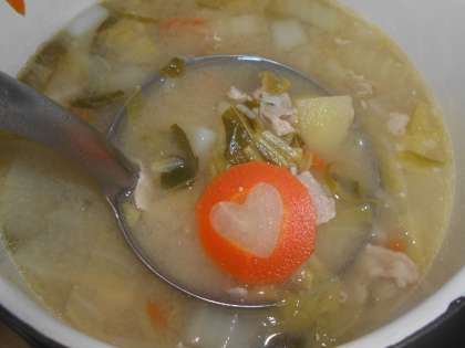 4月12日(火)今日の献立は、ごはん・牛乳・ひよこ豆のフライビーンズ・ゆかり和え・豚汁・のり佃煮でした。豚汁に、すてきな型抜きにんじんが入っていました。調理員さんが、30個ほど作ってくださいました。どこのクラスに入っていたかな?