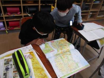 4月13日(水)4年生 社会 地図帳を使って 公開日 2022/04/13 更新日 2022/04/13 2023年度 4年生 4年生の社会科では市から県の学習に入ります。 今日は、地図帳を使って都道府県を見たり、クイズをしたりしました。 色々な都道府県の位置や有名な物をノートに書いて覚えようとしている子どももいました。
