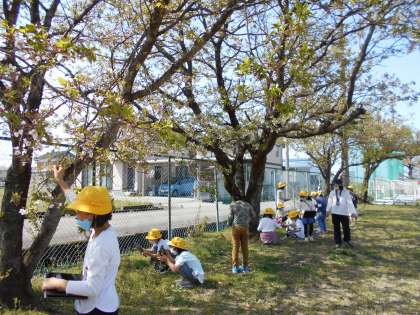今日は、一人一台パソコンを持って、グラウンドや前庭などの春の植物や生き物を探しに行きました。桜やタンポポ、モンシロチョウなどを見つけ、嬉しそうに写真に撮っていました。