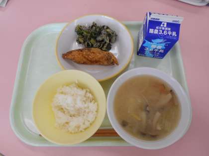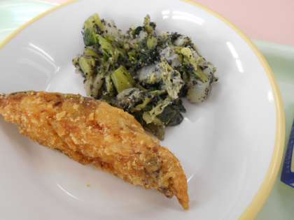 4月14日(木)今日の献立は、ごはん・牛乳・あじの竜田揚げ・よごし・五目みそ汁でした。今日は、「よごし」のお話をしました。「よごし」は、富山県の郷土料理の一つです。野菜をゆでて細かく切り、みそで味つけをしたものです。みそで野菜をよごすことからこの名前がついたと言われています。黒ごまがたっぷり入った、おいしい「よごし」でした。ごはんによく合う料理です。今日はチンゲンサイと白菜を使い、黒ごまとしょうゆで和えました。