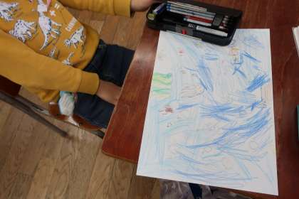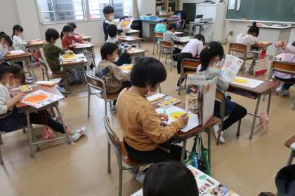 図画工作科では、いろいろな色を組み合わせて、絵をかいています。友達のすてきな工夫を見つけて、まねをしたり、自分で想像した絵をかいたりして楽しみました。
