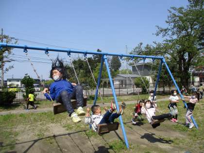 子供たちは、ブランコやジャングルジム、おにごっこ、はないちもんめをして遊びました。体を動かして、とても楽しそうでした。