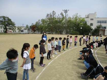 今日は、グラウンドで航空写真の撮影がありました。青い色画用紙で校章のデザインを表しました。ドローンが鳥よりも高く上がっていき、歓声があがりました。。