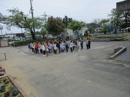 航空写真撮影後は、全校でスキー山で写真を撮りました。みんな静かに集まり、短い時間で撮影を終えた後、学年毎に前庭で撮影しました。