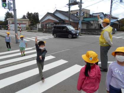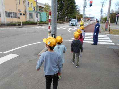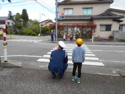 1年生は交通安全教室を行いました。警察官の方や交通安全指導員の方に横断歩道の渡り方を丁寧に指導していただきました。