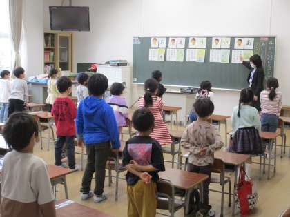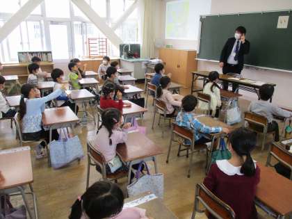 「あいうえお」の口の形を学習した後、それを意識して詩を読んだり言葉探しをしたりしました。「この口の形はどの音かな?」の先生の問いに、一生懸命に考える1年生。もう立派な小学生ですね。