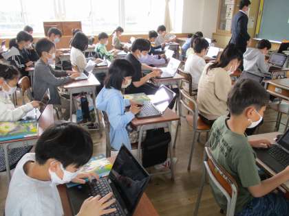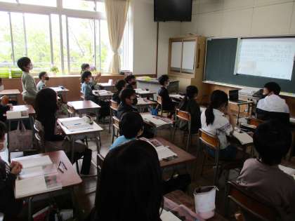 「春は曙」枕草子にならって、自分たちのお気に入りを表現してみました。「春は花見」「春はウグイス」などなど。好きな理由を、子供らしく楽しい文で表現しました。クロムブックを使って、絵や写真を貼り付けたものを見せながら一人一人が発表しました。さすが高学年の学習ですね。