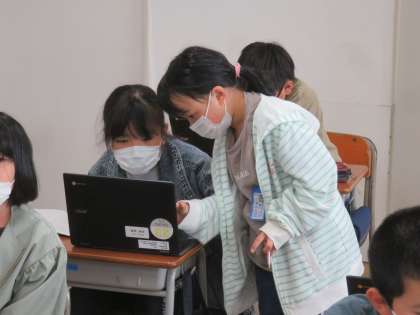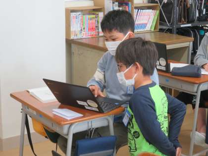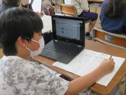 授業の中でパソコンを活用する機会が増えました。今日はクラウドドリルを活用して、授業の復習をしました。自分に必要な問題を選択して、自分の進度に合わせて学習しています。まだまだ操作に戸惑うこともありますが、互いに教え合って、学びを深める姿も見られました。