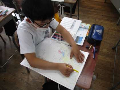 社会科では、日本の国土の特色について、白地図を用いてまとめました。丁寧に色塗りを行い、国土の広がりについて理解を深めていました。