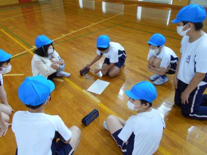 体育科では、運動会で行うリレーの走順を決め、バトンの受け渡しの練習をおこないました。バトンがもらいやすい手の形や位置を考え、受け渡しを行いました。