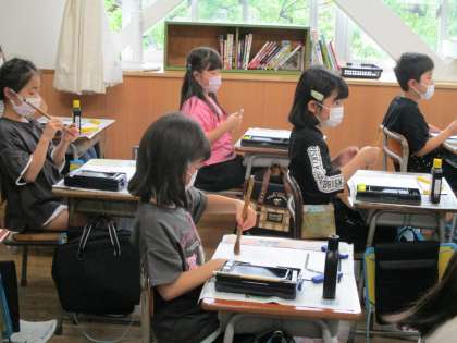 一回目の授業では、道具の説明や筆を持つ練習をしました。