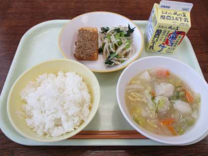 今日の献立は、ごはん、牛乳、揚げ出し豆腐のごまだれかけ、昆布和え、つみれ汁です。右の写真は、昆布和えです。ちょっと分かりにくいですが、きざみ昆布が入っています。和え物にも昆布を使うところは、昆布消費量上位の富山ならではですね。