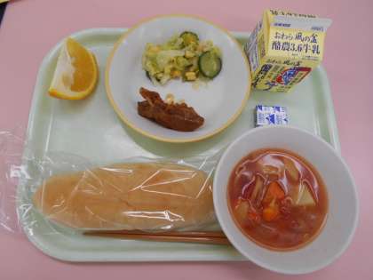 5月9日(月)の献立は、コッペパン・牛乳・照り焼きチキン・コールスローサラダ・ミネストローネ・ポケットチーズ・甘夏みかんでした。「ミネストローネ」とは、「具だくさんのスープ」という意味で、イタリアの野菜スープです。イタリアでは、使う野菜も季節や地方によって様々です。今日は、セロリー、玉ねぎ、にんじん、じゃがいも、白いんげん豆、ウインナーが入りました。野菜がたっぷり入って、栄養満点です。