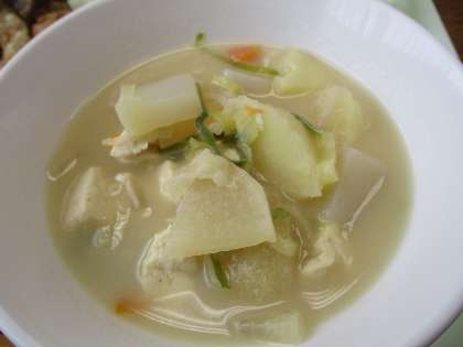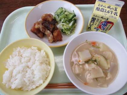 5月11日今日の献立は、ごはん、牛乳、豚肉とレバーの揚げからめ、きざみ和え、ごまけんちんです。けんちん汁は、白ねりごまを溶かしてあるので、ちょっと白っぽく仕上がっています。ごまの風味があり、口当たりのよい汁物になっています。給食では、健康食材の「まごわ(は)やさしい」がよく使われています。今日は「ご」の「ごま」、「や」の「やさい」、「い」の「いも(じゃがいも)」がたっぷり使われていました。おいしくいただきました。