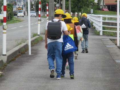 狭い道や交通量の多い所を通ってくる登校班がいくつもあります。1年生はまだ慣れないようで、途中で立ち止まったり前と間が空いたりしている子がいます。そんなとき、上級生は、声をかけ励ましたり、背中を押してあげたり、手をつないで歩いてあげたりして、1年生に頑張って歩くよう促しています。決して攻めることなく・・・今日もそんな場面に出会いました。