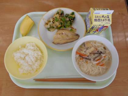 5月12日(木)今日の献立は、ごはん・牛乳・赤魚の塩焼き・いり大豆和え・にゅうめん・バナナでした。にゅうめんは、そうめんを温かい汁で食べる料理で、奈良県の郷土料理です。そうめんは、奈良時代に中国から伝わったそうです。そうめんは、のどごしがよく、するするっと食べられましたが、今日は気温が高かったので、冷たいそうめんがよかったかもしれませんね。